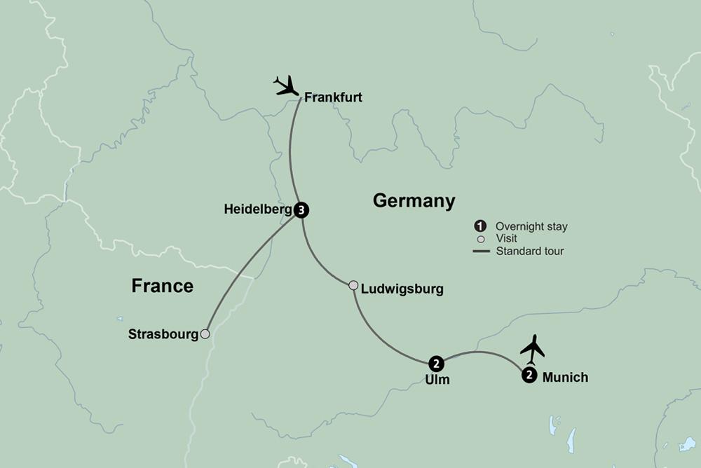 Travel to Strasbourg, where French elegance meets German tradition. Enjoy a Tour Manager-led walk as you leisurely explore the historic Old Quarter, "Petite France," and admire the magnificent cathedral that anchors the city, followed by free time to soak in the festive atmosphere of one of Europe's most celebrated Christmas market cities. Later, return to Heidelberg for an evening at leisure.