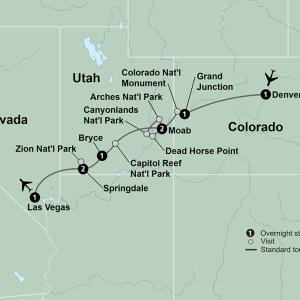 Trek across the Southwest as you take in the sienna-colored canyons, towering spires, and desert landscapes found in Utah's five national parks. The backdrop of Denver's Rocky Mountains is the starting point of your journey. In Colorado's wine country, dine with new friends and enjoy a tasting at a family-run winery. Among vistas that evoke the spirit of the Old West, marvel at the unspoiled beauty of Utah's five national parks. Make your way from Arches and Canyonlands to Capitol Reef, Zion, and Bryce National Park. Discover the bright lights and glitz of Vegas. Explore the kaleidoscope of colors found in America's rocky western landscapes.