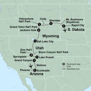 Experience the grandeur of the American West as you explore five fantastic national parks on this exciting journey. In Arizona, contemplate the vast beauty of the Grand Canyon, and in Yellowstone, relish iconic sights like Old Faithful and Yellowstone Lake. Marvel at the magnitude and color of Zion's cliffs and the hoodoos and spires at Bryce Canyon. Enjoy 2-night stays in Springdale, Utah (Zion) and Jackson Hole. Drive through the incredible Bighorn Mountains and the great Sioux Nations Territory before seeing Mt. Rushmore and Crazy Horse Monument. Meet a local Lakota Native American at dinner and learn about their fascinating way of life, past and present. Gain new appreciation of the great outdoors on this journey that takes you from the Grand Canyon to Mount Rushmore National Memorial and everywhere in between.